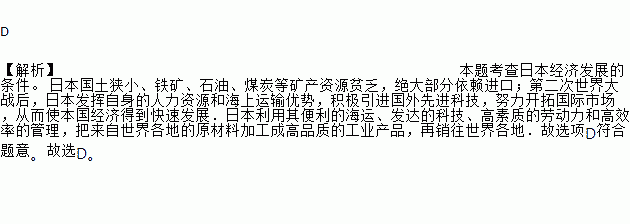 D ¡¾½âÎö¡¿±¾Ì⿼²éÈÕ±¾¾¼Ã·¢Õ¹µÄÌõ¼þ¡£ ÈÕ±¾¹úÍÁÏÁС¡¢Ìú¿ó¡¢Ê¯ÓÍ¡¢ÃºÌ¿µÈ¿ó²ú×ÊԴƶ·¦£¬¾ø´ó²¿·ÖÒÀÀµ½ø¿Ú£»µÚ¶þ´ÎÊÀ½ç´óÕ½ºó£¬ÈÕ±¾·¢»Ó×ÔÉíµÄÈËÁ¦×ÊÔ´ºÍº£ÉÏÔËÊäÓÅÊÆ£¬»ý¼«Òý½ø¹úÍâÏȽø¿Æ¼¼£¬Å¬Á¦¿ªÍعú¼ÊÊг¡£¬´Ó¶øÊ¹±¾¹ú¾¼ÃµÃµ½¿ìËÙ·¢Õ¹£®ÈÕ±¾ÀûÓÃÆä±ãÀûµÄº£ÔË¡¢·¢´ïµÄ¿Æ¼¼¡¢¸ßËØÖʵÄÀͶ¯Á¦ºÍ¸ßЧÂʵĹÜÀí£¬°ÑÀ´×ÔÊÀ½ç¸÷µØµÄÔ²ÄÁϼӹ¤³É¸ßÆ·ÖʵĹ¤Òµ²úÆ·£¬ÔÙÏúÍùÊÀ½ç¸÷µØ£®¹ÊÑ¡ÏîD·ûºÏÌâÒâ¡£¹ÊÑ¡D¡£ ...