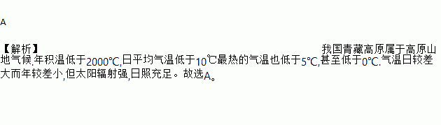 A 【解析】我国青藏高原属于高原山地气候.年积温低于2000℃,日平均气温低于10℃最热的气温也低于5℃,甚至低于0℃.气温日较差大而年较差小,但太阳辐射强,日照充足。故选A。