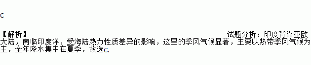 C 【解析】试题分析:印度背靠亚欧大陆,南临印度洋,受海陆热力性质差异的影响,这里的季风气候显著,主要以热带季风气候为主,全年降水集中在夏季,故选C.