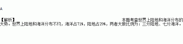A. 三分陆地、七分海洋 B. 各占1/2 C. 1/4是海洋 D. 2/3是陆地