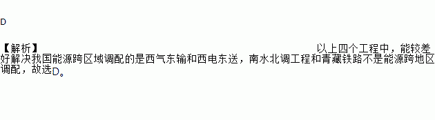 D 【解析】以上四个工程中,能较差好解决我国能源跨区域调配的是西气东输和西电东送,南水北调工程和青藏铁路不是能源跨地区调配,故选D。