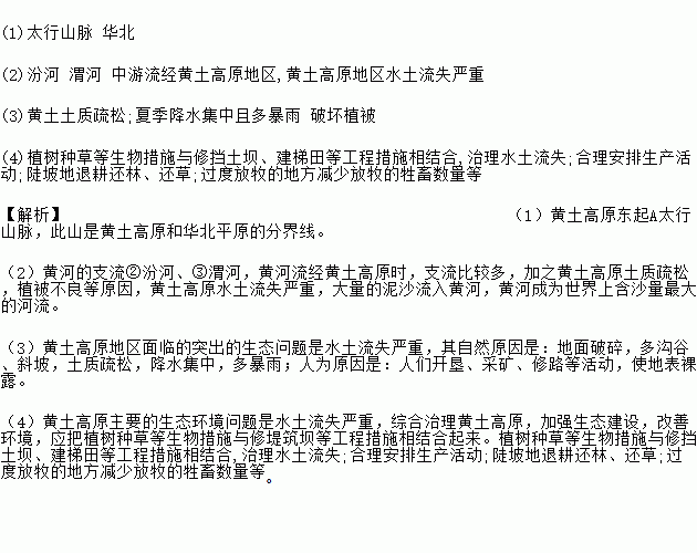 (1)Ì«ÐÐɽÂö »ª±± (2)·ÚºÓ μºÓ ÖÐÓÎÁ÷¾»ÆÍÁ¸ßÔµØÇø,»ÆÍÁ¸ßÔµØÇøË®ÍÁÁ÷ʧÑÏÖØ (3)»ÆÍÁÍÁÖÊÊèËÉ;Ïļ¾½µË®¼¯ÖÐÇҶ౩Óê ÆÆ»µÖ²±» (4)Ö²Ê÷ÖֲݵÈÉúÎï´ëÊ©ÓëÐÞµ²ÍÁ°Ó¡¢½¨ÌÝÌïµÈ¹¤³Ì´ëÊ©Ïà½áºÏ,ÖÎÀíË®ÍÁÁ÷ʧ;ºÏÀí°²ÅÅÉú²ú»î¶¯;¶¸ÆÂµØÍ˸û»¹ÁÖ¡¢»¹²Ý;¹ý¶È·ÅÄÁµÄµØ·½¼õÉÙ·ÅÄÁµÄÉüÐóÊýÁ¿µÈ ¡¾½âÎö¡¿£¨1£©»ÆÍÁ¸ßÔ¶«ÆðAÌ«ÐÐɽÂö£¬´ËɽÊÇ»ÆÍÁ¸ßԺͻª±±Æ½ÔµÄ·Ö½çÏß¡£ £¨2£©...
