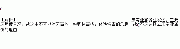 C 【解析】东南亚旅游业发达,主要是热带景观,故这里不可能冰天雪地,坐狗拉雪橇,体验滑雪的乐趣,故C不是选择去东南亚旅游的理由。