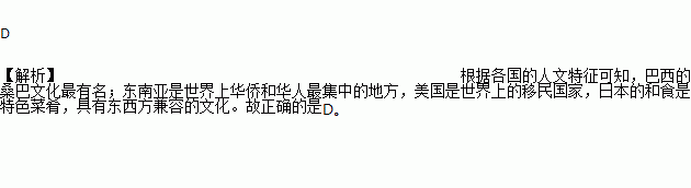 A. 印度——桑巴文化 B. 巴西—是海外华人华侨最集中的地方