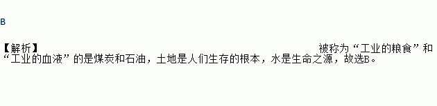 B 【解析】被称为“工业的粮食”和“工业的血液”的是煤炭和石油,土地是人们生存的根本,水是生命之源,故选B。