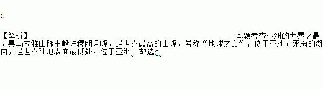 C 【解析】本题考查亚洲的世界之最。喜马拉雅山脉主峰珠穆朗玛峰,是世界最高的山峰,号称“地球之巅”,位于亚洲;死海的湖面,是世界陆地表面最低处,位于亚洲。故选C。