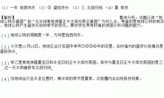 (1)一年 自西向东 (2)③ 昼短夜长 (3)乙 北回归线 (4)夏 极夜 【解析】整体分析:该题以读“地球公转示意图”和“北半球某地房屋正午太阳光照示意图”为切入点,考查的是地球公转的特点,地球公转产生昼夜长短和季节的变化,要求学生具有较强的读图分析问题的能力。 (1)地球公转的周期是一年,方向是自西向东。 (2)今天是11月13日,地球正运行在图中序号①②③④中的③置,此时...