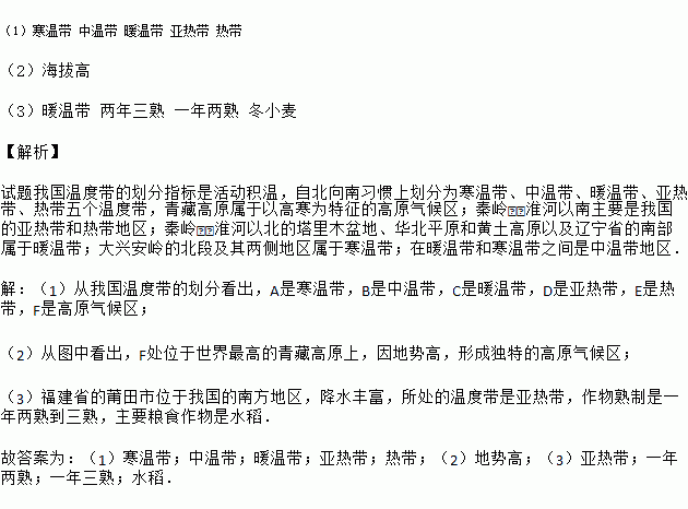 (1)写出图中字母代表的温度带名称A________,B________,C________,D________,E________。