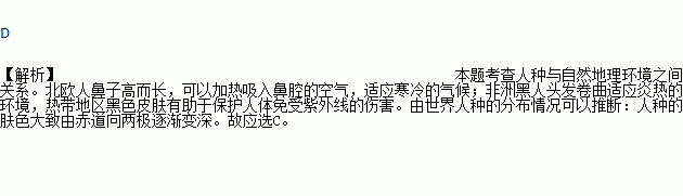 C. 人种的肤色大致由赤道向两极逐渐变深
