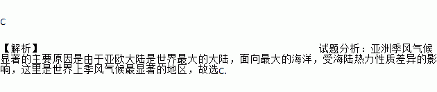 C 【解析】试题分析:亚洲季风气候显著的主要原因是由于亚欧大陆是世界最大的大陆,面向最大的海洋,受海陆热力性质差异的影响,这里是世界上季风气候最显著的地区,故选C.