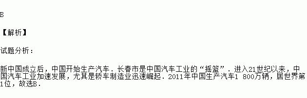 B 【解析】 试题分析: 新中国成立后,中国开始生产汽车.长春市是中国汽车工业的“摇篮”.进入21世纪以来,中国汽车工业加速发展,尤其是轿车制造业迅速崛起.2011年中国生产汽车1 800万辆,居世界第1位,故选B.