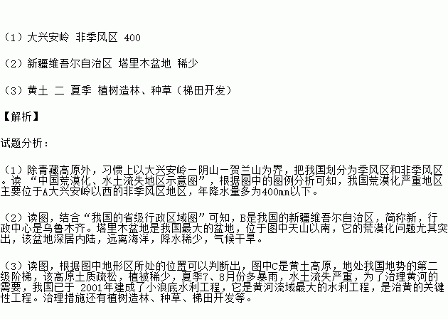 (1)大兴安岭 非季风区 400 (2)新疆维吾尔自治区 塔里木盆地 稀少 (3)黄土 二 夏季 植树造林、种草(梯田开发) 【解析】 试题分析: (1)除青藏高原外,习惯上以大兴安岭—阴山—贺兰山为界,把我国划分为季风区和非季风区。读 “中国荒漠化、水土流失地区示意图”,根据图中的图例分析可知,我国荒漠化严重地区主要位于A大兴安岭以西的非季风区地区,年降水量多为40...