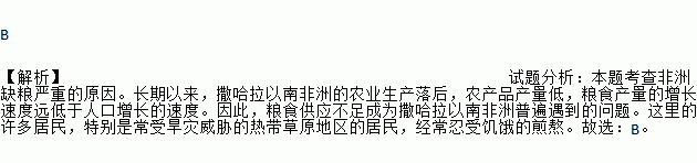 B 【解析】试题分析:本题考查非洲缺粮严重的原因。长期以来,撒哈拉以南非洲的农业生产落后,农产品产量低,粮食产量的增长速度远低于人口增长的速度。因此,粮食供应不足成为撒哈拉以南非洲普遍遇到的问题。这里的许多居民,特别是常受旱灾威胁的热带草原地区的居民,经常忍受饥饿的煎熬。故选:B。