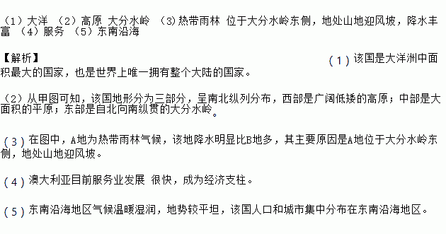 £¨1£©´óÑó £¨2£©¸ßÔ ´ó·ÖË®Áë £¨3)ÈÈ´øÓêÁÖ Î»ÓÚ´ó·ÖË®Áë¶«²à£¬µØ´¦É½µØÓ·çÆÂ£¬½µË®·á¸» £¨4£©·þÎñ £¨5£©¶«ÄÏÑØº£ ¡¾½âÎö¡¿£¨1£©¸Ã¹úÊÇ´óÑóÖÞÖÐÃæ»ý×î´óµÄ¹ú¼Ò£¬Ò²ÊÇÊÀ½çÉÏΨһӵÓÐÕû¸ö´ó½µÄ¹ú¼Ò¡£ £¨2£©´Ó¼×ͼ¿ÉÖª£¬¸Ã¹úµØÐηÖΪÈý²¿·Ö£¬³ÊÄϱ±×ÝÁзֲ¼£¬Î÷²¿ÊǹãÀ«µÍ°«µÄ¸ßÔ£»Öв¿ÊÇ´óÃæ»ýµÄƽԣ»¶«²¿ÊÇ×Ô±±ÏòÄÏ×ݹáµÄ´ó·ÖË®Áë¡£ £¨3£©ÔÚͼÖУ¬AµØÎªÈÈ´øÓêÁÖÆøºò£¬¸ÃµØ½µË®Ã÷ÏÔ±ÈBµØ...