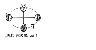 (4)地球运动到B时是北半球夏至日,此时太阳直射北回归线,北极圈以内出现极昼现象,南极圈出现极夜现象。