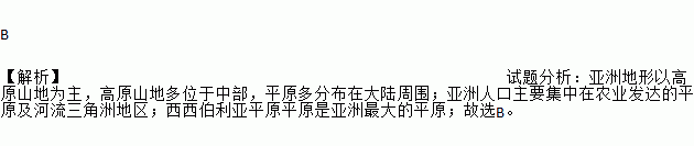 B 【解析】试题分析:亚洲地形以高原山地为主,高原山地多位于中部,平原多分布在大陆周围;亚洲人口主要集中在农业发达的平原及河流三角洲地区;西西伯利亚平原平原是亚洲最大的平原;故选B。