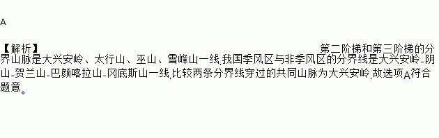 A 【解析】第二阶梯和第三阶梯的分界山脉是大兴安岭、太行山、巫山、雪峰山一线.我国季风区与非季风区的分界线是大兴安岭-阴山-贺兰山-巴颜喀拉山-冈底斯山一线.比较两条分界线穿过的共同山脉为大兴安岭.故选项A符合题意。