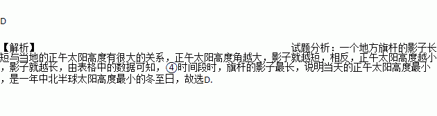 我国某校地理兴趣小组分别在图示的四个节气当天,于当地正午时刻测量学校旗杆的影子长度,数据记录见表乙.