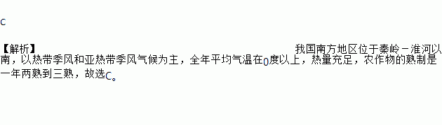 C 【解析】我国南方地区位于秦岭-淮河以南,以热带季风和亚热带季风气候为主,全年平均气温在0度以上,热量充足,农作物的熟制是一年两熟到三熟,故选C。