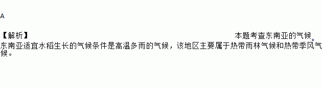 A 【解析】本题考查东南亚的气候。东南亚适宜水稻生长的气候条件是高温多雨的气候,该地区主要属于热带雨林气候和热带季风气候。