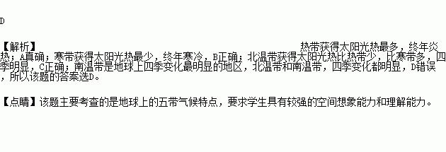 A,热带获得太阳光热最多,终年炎热 B.寒带获得太阳光热最少,终年寒冷