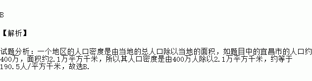 B 【解析】 试题分析:一个地区的人口密度是由当地的总人口除以当地的面积,如题目中的宜昌市的人口约400万,面积约2.1万平方千米,所以其人口密度是由400万人除以2.1万平方千米,约等于190.5人/平方千米,故选B.