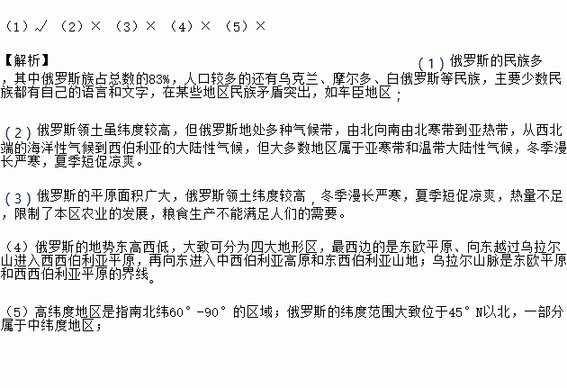 £¨1£©¡Ì £¨2£©¡Á £¨3£©¡Á £¨4£©¡Á £¨5£©¡Á ¡¾½âÎö¡¿£¨1£©¶íÂÞ˹µÄÃñ×å¶à£¬ÆäÖжíÂÞ˹×åÕ¼×ÜÊýµÄ83%£¬È˿ڽ϶àµÄ»¹ÓÐÎÚ¿ËÀ¼¡¢Ä¦¶û¶à¡¢°×¶íÂÞ˹µÈÃñ×壬Ö÷ÒªÉÙÊýÃñ×å¶¼ÓÐ×Ô¼ºµÄÓïÑÔºÍÎÄ×Ö£¬ÔÚijЩµØÇøÃñ×åì¶ÜÍ»³ö£¬Èç³µ³¼µØÇø£» £¨2£©¶íÂÞ˹ÁìÍÁËäγ¶È½Ï¸ß£¬µ«¶íÂÞ˹µØ´¦¶àÖÖÆøºò´ø£¬Óɱ±ÏòÄÏÓɱ±º®´øµ½ÑÇÈÈ´ø£¬´ÓÎ÷±±¶ËµÄº£ÑóÐÔÆøºòµ½Î÷²®ÀûÑǵĴó½ÐÔÆøºò£¬µ«´ó¶àÊýµØÇøÊôÓÚÑǺ®´øºÍδø´ó½ÐÔÆøºò£¬...
