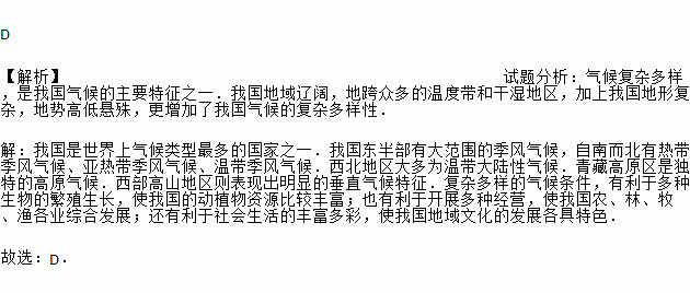 D ¡¾½âÎö¡¿ÊÔÌâ·ÖÎö£ºÆøºò¸´ÔÓ¶àÑù£¬ÊÇÎÒ¹úÆøºòµÄÖ÷ÒªÌØÕ÷Ö®Ò»£®ÎÒ¹úµØÓòÁÉÀ«£¬µØ¿çÖÚ¶àµÄζȴøºÍ¸ÉʪµØÇø£¬¼ÓÉÏÎÒ¹úµØÐθ´ÔÓ£¬µØÊƸߵÍÐüÊ⣬¸üÔö¼ÓÁËÎÒ¹úÆøºòµÄ¸´ÔÓ¶àÑùÐÔ£® ¡¾½âÎö¡¿ ÎÒ¹úÊÇÊÀ½çÉÏÆøºòÀàÐÍ×î¶àµÄ¹ú¼ÒÖ®Ò»£®ÎÒ¹ú¶«°ë²¿Óдó·¶Î§µÄ¼¾·çÆøºò£¬×ÔÄ϶ø±±ÓÐÈÈ´ø¼¾·çÆøºò¡¢ÑÇÈÈ´ø¼¾·çÆøºò¡¢Î´ø¼¾·çÆøºò£®Î÷±±µØÇø´ó¶àΪδø´ó½ÐÔÆøºò£®Çà²Ø¸ßÔÇøÊǶÀÌØµÄ¸ßÔÆøºò£®Î÷²¿¸ßɽµØÇøÔò±íÏÖ³öÃ÷ÏԵĴ¹Ö±...