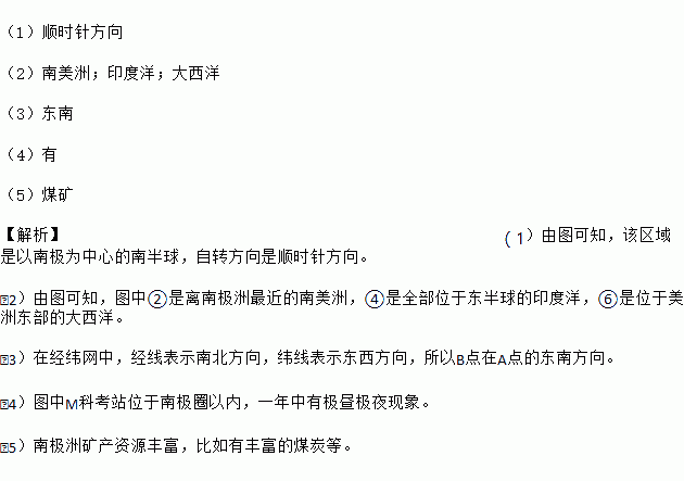 £¨1£©Ë³Ê±Õë·½Ïò £¨2£©ÄÏÃÀÖÞ£»Ó¡¶ÈÑó£»´óÎ÷Ñó £¨3£©¶«ÄÏ £¨4£©ÓÐ £¨5£©Ãº¿ó ¡¾½âÎö¡¿£¨1£©ÓÉͼ¿ÉÖª£¬¸ÃÇøÓòÊÇÒÔÄϼ«ÎªÖÐÐĵÄÄϰëÇò£¬×Ôת·½ÏòÊÇ˳ʱÕë·½Ïò¡£ £¨2£©ÓÉͼ¿ÉÖª£¬Í¼ÖТÚÊÇÀëÄϼ«ÖÞ×î½üµÄÄÏÃÀÖÞ£¬¢ÜÊÇÈ«²¿Î»ÓÚ¶«°ëÇòµÄÓ¡¶ÈÑ󣬢ÞÊÇλÓÚÃÀÖÞ¶«²¿µÄ´óÎ÷Ñó¡£ £¨3£©ÔÚ¾Î³ÍøÖУ¬¾Ïß±íʾÄϱ±·½Ïò£¬Î³Ïß±íʾ¶«Î÷·½Ïò£¬ËùÒÔBµãÔÚAµãµÄ¶«ÄÏ·½Ïò¡£ £¨4£©Í¼...
