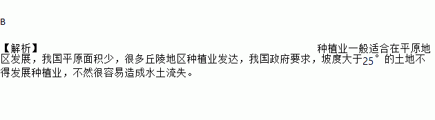 B 【解析】种植业一般适合在平原地区发展,我国平原面积少,很多丘陵地区种植业发达,我国政府要求,坡度大于25°的土地不得发展种植业,不然很容易造成水土流失。