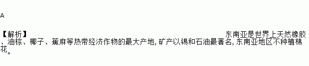 A 【解析】东南亚是世界上天然橡胶、油棕、椰子、蕉麻等热带经济作物的最大产地,矿产以锡和石油最著名,东南亚地区不种植棉花。