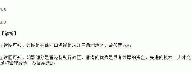 1.B 2.D 【解析】 1.读图可知,该图是在珠江口沿岸是珠江三角洲地区,故答案选B。 2.读图可知,阴影部分是香港特别行政区,香港的优势是具有雄厚的资金、先进的技术、人才充足和管理经验,故答案选D。