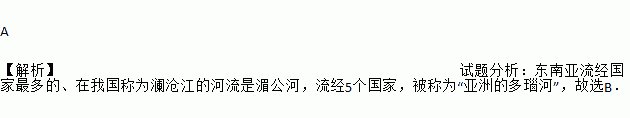 A 【解析】试题分析:东南亚流经国家最多的、在我国称为澜沧江的河流是湄公河,流经5个国家,被称为“亚洲的多瑙河”,故选B.