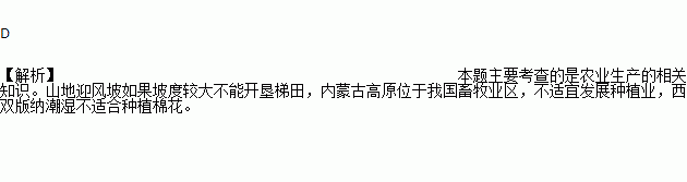A. 山地迎风坡降水较多种植水稻 B. 内蒙古高原夏季高温种植热带水果