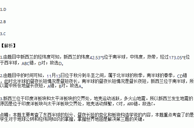 北京时间2016年11月13日新西兰(震中位于42.53?S,173.05?E)发生了8.0级地震。据此回答下列各题。