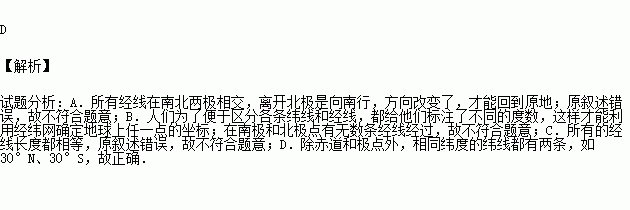 D.除赤道和极点以外,相同纬度的纬线都有两条