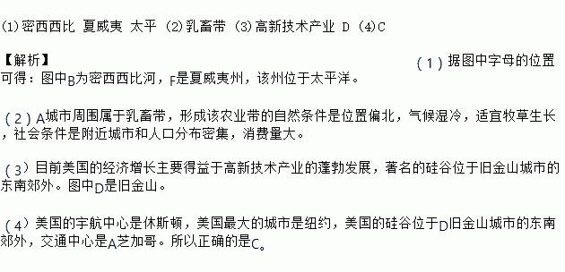 (1)密西西比 夏威夷 太平 (2)乳畜带 (3)高新技术产业 D (4)C 【解析】(1)据图中字母的位置可得:图中B为密西西比河,F是夏威夷州,该州位于太平洋。 (2)A城市周围属于乳畜带,形成该农业带的自然条件是位置偏北,气候湿冷,适宜牧草生长,社会条件是附近城市和人口分布密集,消费量大。 (3)目前美国的经济增长主要得益于高新技术产业的蓬勃发展,著名的硅谷位于旧金山城市的...