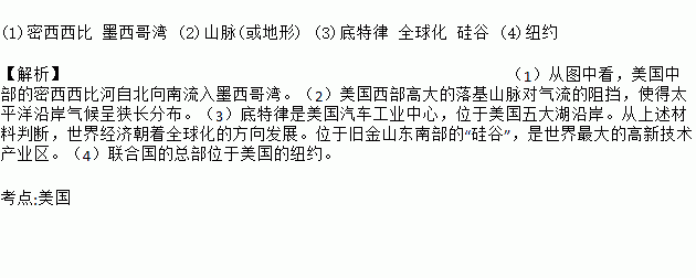 (1)密西西比 墨西哥湾 (2)山脉(或地形) (3)底特律 全球化 硅谷 (4)纽约 【解析】(1)从图中看,美国中部的密西西比河自北向南流入墨西哥湾。(2)美国西部高大的落基山脉对气流的阻挡,使得太平洋沿岸气候呈狭长分布。(3)底特律是美国汽车工业中心,位于美国五大湖沿岸。从上述材料判断,世界经济朝着全球化的方向发展。位于旧金山东南部的“硅谷”,是世界最大的高新技术产业区。(4)联合国的...