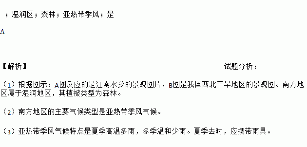 A;湿润区;森林;亚热带季风;是 【解析】试题分析: (1)根据图示:A图反应的是江南水乡的景观图片,B图是我国西北干旱地区的景观图。南方地区属于湿润地区,其植被类型为森林。 (2)南方地区的主要气候类型是亚热带季风气候。 (3)亚热带季风气候特点是夏季高温多雨,冬季温和少雨。夏季去时,应携带雨具。