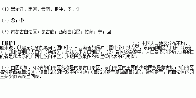 (1)连接图中①②两地是我国人口地理分界线.其中①是________省的________市,②是________省的________县,此线东南人口________,西北人口________.
