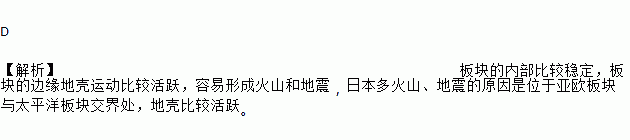 D 【解析】板块的内部比较稳定,板块的边缘地壳运动比较活跃,容易形成火山和地震,日本多火山、地震的原因是位于亚欧板块与太平洋板块交界处,地壳比较活跃。