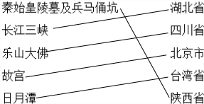 解答 解:秦始皇陵兵马俑位于陕西省,长江三峡位于湖北省与重庆市的交汇处,乐山大佛位于四川省,故宫位于北京市,日月潭位于台湾省,根据题意.