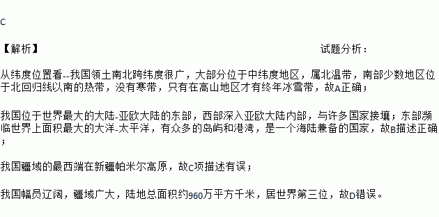 C 【解析】试题分析: 从纬度位置看--我国领土南北跨纬度很广,大部分位于中纬度地区,属北温带,南部少数地区位于北回归线以南的热带,没有寒带,只有在高山地区才有终年冰雪带,故A正确; 我国位于世界最大的大陆-亚欧大陆的东部,西部深入亚欧大陆内部,与许多国家接壤;东部濒临世界上面积最大的大洋-太平洋,有众多的岛屿和港湾,是一个海陆兼备的国家,故B描述正确; 我国疆域的最西端在...