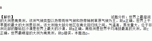 B ¡¾½âÎö¡¿ÊÔÌâ·ÖÎö£ºÊÀ½çÉÏ×îʪÈóµÄ´óÖÞÊÇÄÏÃÀÖÞ£¬¸ÃÖÞÆøºòÀàÐÍÒÔÈÈ´øÓêÁÖÆøºòºÍÈÈ´øÏ¡Ê÷²ÝÔÆøºòΪÖ÷£¬¹ÊAÕýÈ·¡£ÊÀ½çÉϸɺµÃæ»ý×î´óµÄ´óÖÞÊÇ·ÇÖÞ£¬¸Ã´óÖÞ¾ø´ó²¿·ÖµØÇøÔÚÄϱ±»Ø¹éÏßÖ®¼ä£¬ÆøÎ¸ߣ¬Õô·¢Á¿´ó£¬Î»ÓÚ·ÇÖÞ±±²¿µÄÈö¹þÀɳĮÊÇÊÀ½çÉÏ×î´óµÄɳĮ£¬¹ÊBÕýÈ·¡£Äϼ«ÖÞÊÇÊÀ½çƽ¾ùº£°Î×î¸ßµÄ´óÖÞ£¬¹ÊCÕýÈ·¡£ÊÀ½ç×îůʪµÄ´óÖÞΪÄÏÃÀÖÞ£¬¹ÊD´íÎó¡£±¾ÌâÑ¡D¡£