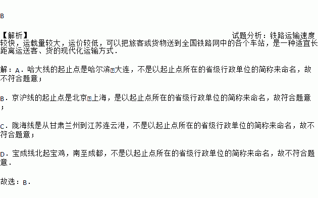 B 【解析】试题分析:铁路运输速度较快,运载量较大,运价较低,可以把旅客或货物送到全国铁路网中的各个车站,是一种适宜长距离运送客、货的现代化运输方式. 【解析】 A.哈大线的起止点是哈尔滨﹣大连,不是以起止点所在的省级行政单位的简称来命名,故不符合题意; B.京沪线的起止点是北京﹣上海,是以起止点所在的省级行政单位的简称来命名,故符合题意; C.陇海线是从甘肃兰州到江苏连...