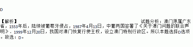 D 【解析】试题分析:澳门原属广东省,1553年后,陆续被葡萄牙侵占,1987年4月13日,中葡两国签署了《关于澳门问题的联合声明》.1999年12月20日,我国对澳门恢复行使主权,设立澳门特别行政区。所以本题选择D选项。故选:D。