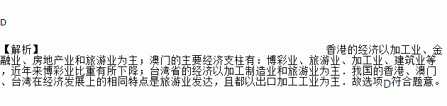 D ¡¾½âÎö¡¿Ïã¸ÛµÄ¾¼ÃÒÔ¼Ó¹¤Òµ¡¢½ðÈÚÒµ¡¢·¿µØ²úÒµºÍÂÃÓÎҵΪÖ÷£»°ÄÃŵÄÖ÷Òª¾¼ÃÖ§ÖùÓУº²©²ÊÒµ¡¢ÂÃÓÎÒµ¡¢¼Ó¹¤Òµ¡¢½¨ÖþÒµµÈ£¬½üÄêÀ´²©²ÊÒµ±ÈÖØÓÐËùϽµ£»Ì¨ÍåÊ¡µÄ¾¼ÃÒÔ¼Ó¹¤ÖÆÔìÒµºÍÂÃÓÎҵΪÖ÷£®ÎÒ¹úµÄÏã¸Û¡¢°ÄÃÅ¡¢Ì¨ÍåÔÚ¾¼Ã·¢Õ¹ÉϵÄÏàÍ¬ÌØµãÊÇÂÃÓÎÒµ·¢´ï£¬ÇÒ¶¼ÒÔ³ö¿Ú¼Ó¹¤¹¤ÒµÎªÖ÷£®¹ÊÑ¡ÏîD·ûºÏÌâÒâ¡£