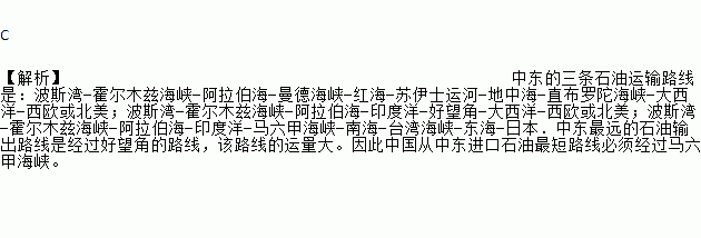 C 【解析】中东的三条石油运输路线是:波斯湾-霍尔木兹海峡-阿拉伯海-曼德海峡-红海-苏伊士运河-地中海-直布罗陀海峡-大西洋-西欧或北美;波斯湾-霍尔木兹海峡-阿拉伯海-印度洋-好望角-大西洋-西欧或北美;波斯湾-霍尔木兹海峡-阿拉伯海-印度洋-马六甲海峡-南海-台湾海峡-东海-日本.中东最远的石油输出路线是经过好望角的路线,该路线的运量大。因此中国从中东进口石油最短路线必须经过马六甲海峡...
