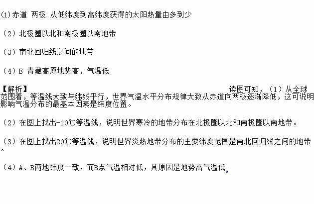 (1)³àµÀ Á½¼« ´ÓµÍγ¶Èµ½¸ßγ¶È»ñµÃµÄÌ«ÑôÈÈÁ¿ÓɶൽÉÙ £¨2£©±±¼«È¦ÒÔ±±ºÍÄϼ«È¦ÒÔÄϵشø £¨3£©Äϱ±»Ø¹éÏßÖ®¼äµÄµØ´ø £¨4£©B Çà²Ø¸ßÔµØÊƸߣ¬ÆøÎÂµÍ ¡¾½âÎö¡¿¶Áͼ¿ÉÖª£¬£¨1£©´ÓÈ«Çò·¶Î§¿´£¬µÈÎÂÏß´óÖÂÓëγÏ߯½ÐУ¬ÊÀ½çÆøÎÂˮƽ·Ö²¼¹æÂÉ´óÖ´ӳàµÀÏòÁ½¼«Öð½¥½µµÍ£¬Õâ¿É˵Ã÷Ó°ÏìÆøÎ·ֲ¼µÄ×î»ù±¾ÒòËØÊÇγ¶ÈλÖᣠ£¨2£©ÔÚͼÉÏÕÒ³ö-10¡æµÈÎÂÏߣ¬ËµÃ÷ÊÀ½çº®ÀäµÄµØ´ø·Ö²¼ÔÚ±±¼«È¦ÒÔ...