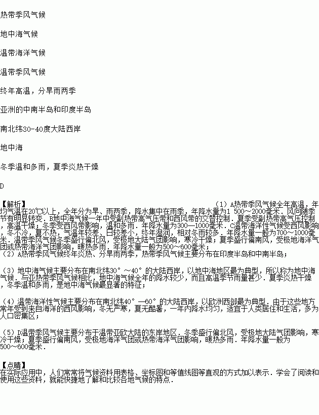 (4)具有夏季高温多雨、冬季寒冷干燥气候特征的是图_________(填字母)。